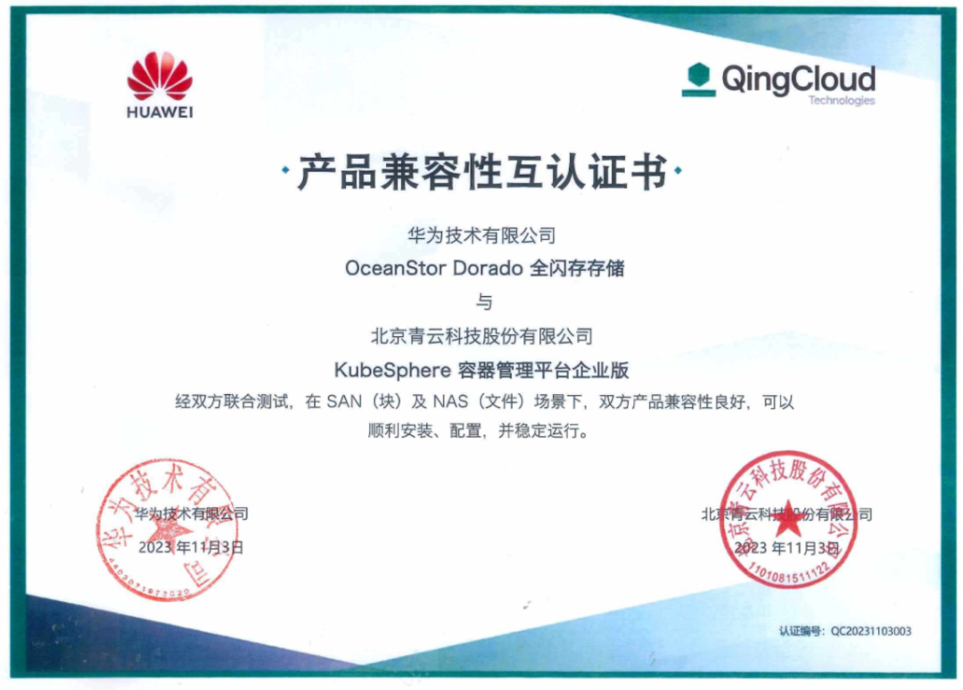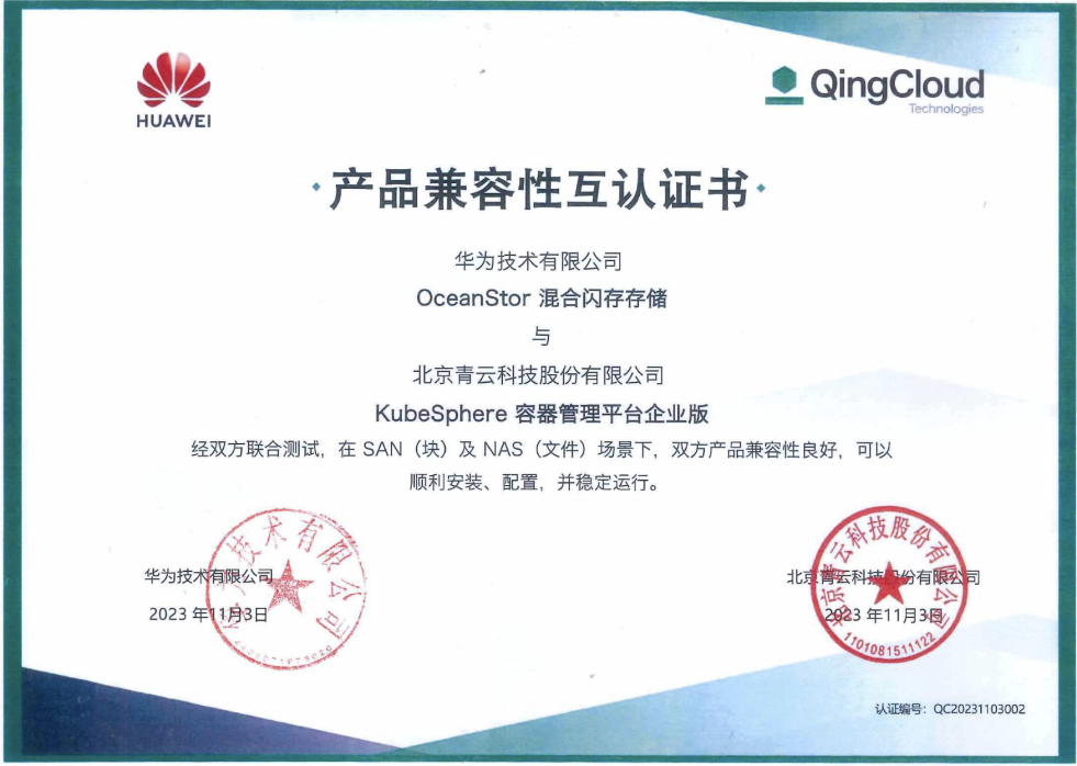 近日,青云科技旗下 KubeSphere 企业版容器平台成功完成了与华为 OceanStor 系列存储产品的兼容性互认证,进一步丰富了企业在容器存算分离架构下管理平台及容器数据存储上的选择。数字化转型浪潮中,容器技术正成为企业提升研发效率、优化资源配置的关键利器。作为国内领先的企业级容器平台,青云科技旗下的 KubeSphere 企业版容器平台凭借其便捷的实操性、丰富的可观测性和稳定的可靠性,赢得了众多企业的信赖。而华为 OceanStor 系列存储产品,凭借其高性能、高可靠、高可扩展的特点,为企业和机构提供了稳定、高效的存储解决方案。此次兼容性测试的成功,意味着企业在使用 KubeSphere 企业版容器平台的过程中,可以无缝切换到华为 OceanStor 全闪存存储、混合闪存存储及 OceanStor Pacific 分布式存储,满足不同场景下的数据存储需求。