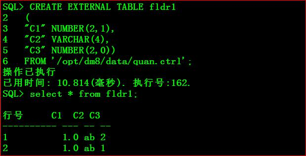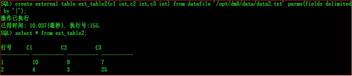 create external table ext_table2(c1 int,c2 int,c3 int) from datafile '/opt/dm8/data/data2.txt' parms(fields delimited by '|');