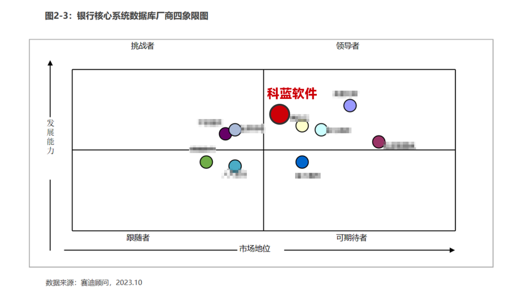 赛迪顾问直属工业和信息化部中国电子信息产业发展研究院,是国内ICT领域的权威研究机构。赛迪报告评价模型采用竞争力四象限图模型,从技术先进性和产品安全性两个维度对企业展开评估。根据本次评估,科蓝软件凭借SUNDB数据库在法律层面拥有高度自治权和自主掌控权以及卓越的发展能力和市场地位,入选银行核心系统数据库厂商领导者象限。