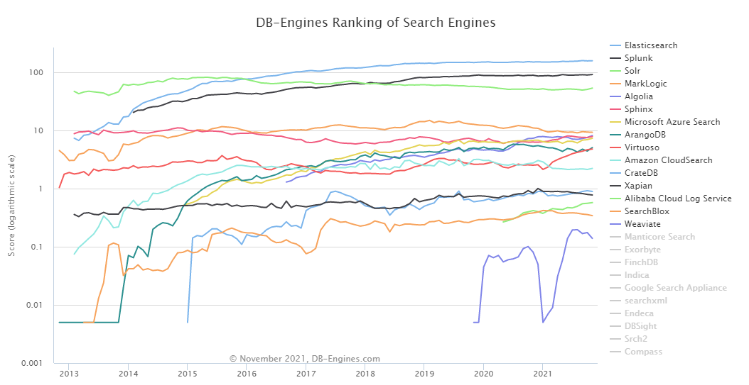 2010 年开源的 Elasticsearch 随着全球搜索引擎业务的飞速发展,也变得更加流行。在国内外积累了大量的核心用户并受到社区的强烈欢迎。根据 DB-Engines[2] 网站对于 Search Engine 类数据库的流行度趋势统计,2016 年至今 Elasticsearch 始终保持第一。