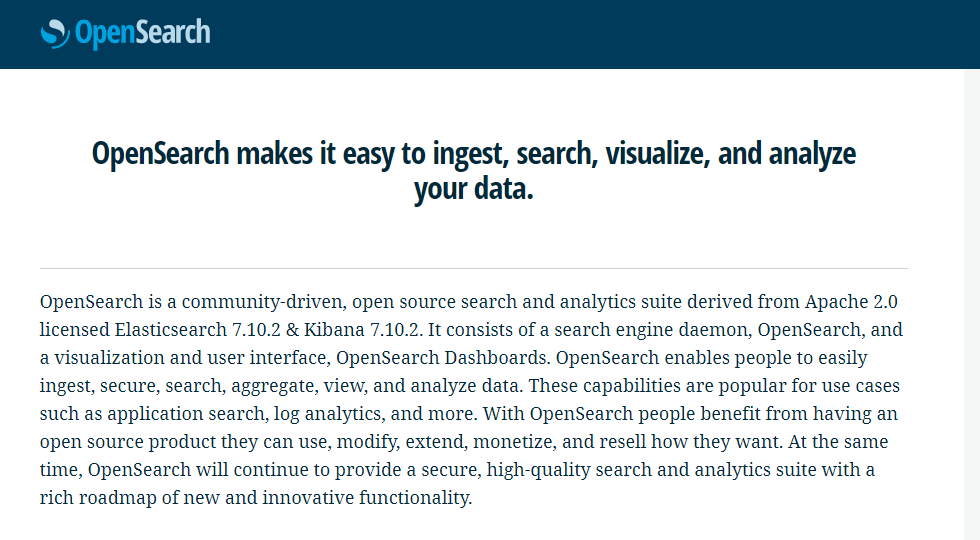 OpenSearch 是一个社区驱动的开源搜索和分析套件,源自 Apache 2.0 许可的 Elasticsearch 7.10.2 和 Kibana 7.10.2。它由一个搜索引擎守护进程 OpenSearch 和一个可视化和用户界面 OpenSearch Dashboards 组成。OpenSearch 使人们能够轻松摄取、保护、搜索、聚合、查看和分析数据。