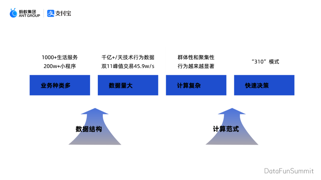 业务种类越来越多,蚂蚁有超过1000种类型的生活服务,几百万以上小程序,这使得业务极其复杂,进一步提高对复杂数据数据处理能力的要求。