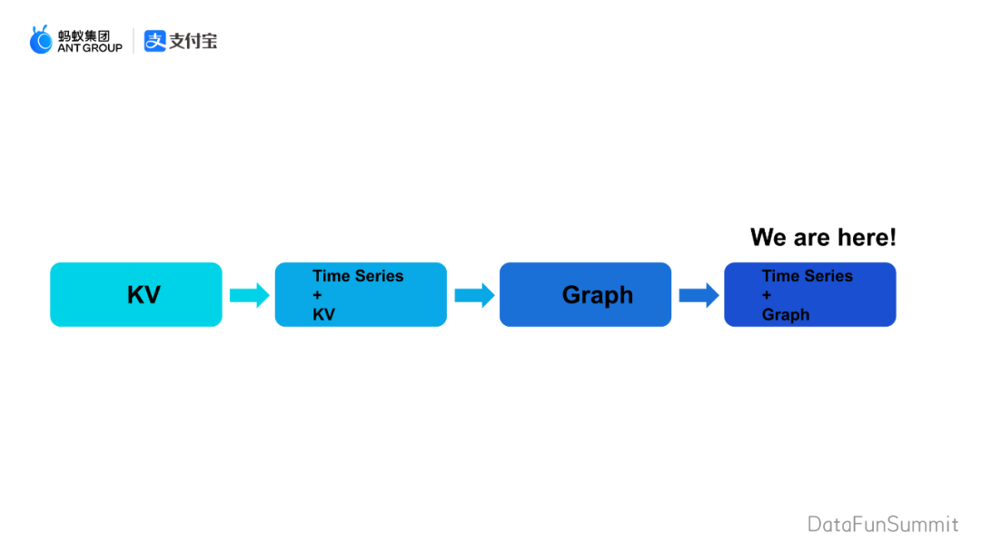 典型案例就是KV存储,主体描述场景下KV存储可以使查询性能、吞吐量都非常的高,接着逐渐发现光有描述不行,随时间变化主体信息会变,这时就需要加上时序这个维度,紧接着又发现单一维度的描述不足以充分描述一个主体,我们需要更多维的信息,这时就需要通过图存储来实现,实现之后,我们发现因为各个维度均有可能产生变化,进一步导致图也会随着时间变化,这样就了时序图的存储的需求。