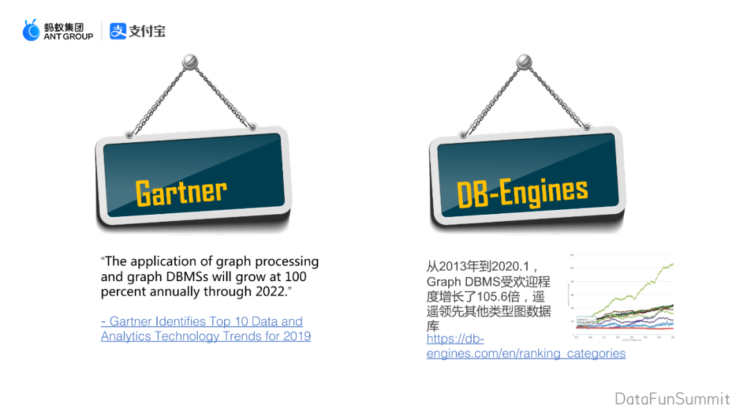 图技术研发方面图数据库是一个非常热门的领域,Gartner给出的报告,就图计算和图存储应用预计到2022年之前会增加一倍,DB-Engines上可以看到图数据库的受欢迎程度远远领先其它类型数据库。