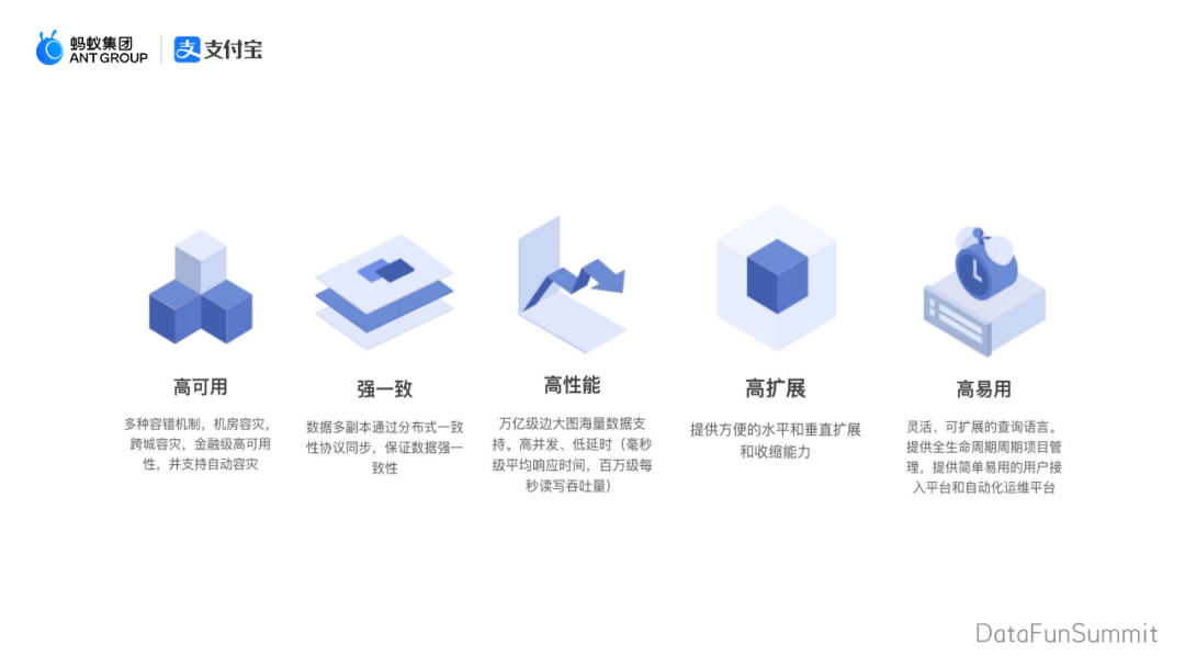 蚂蚁金服构建了一个金融级分布式图数据库,提供高性能查询分析能力和多维时序图查询能力,并且能够支撑海量的数据存储,另外还提供了很好的易用性,能在图开发过程中支持所见即所得。