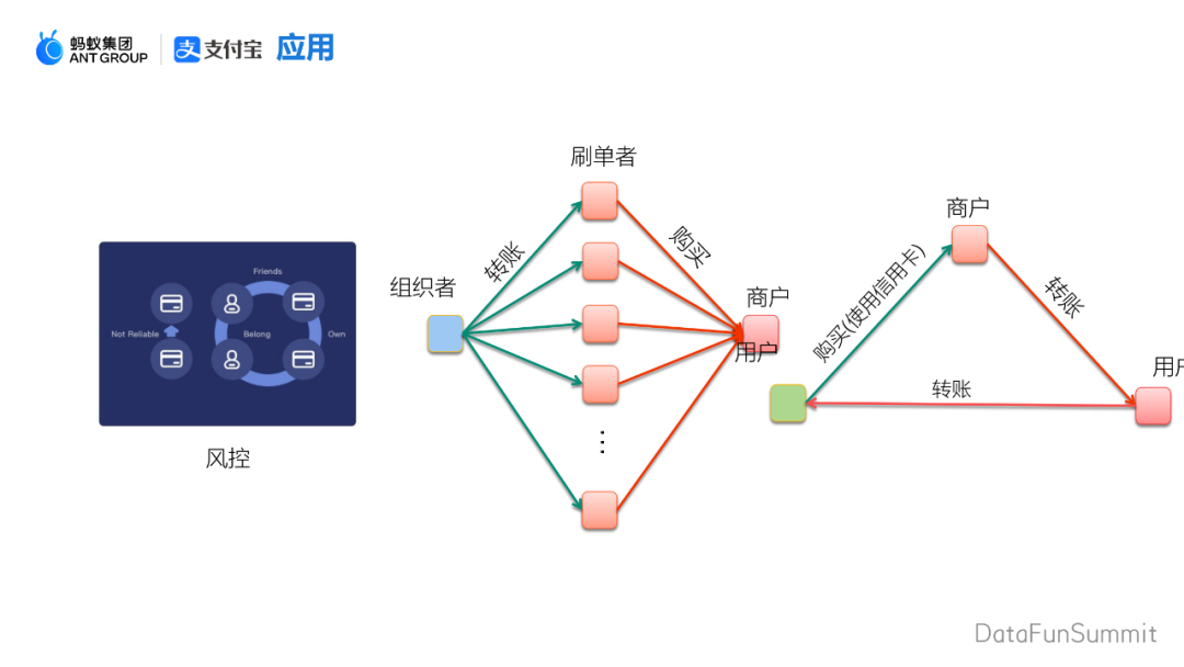 刷单诈骗:刷单会有组织者,背后有一堆执行刷单的人,一般他们都用匿名信息来进行操作,所以在事后很难找到这些人。像这样的诈骗操作,我们需要在诈骗行为发生的当下,就发现这个诈骗行为,然后扼杀在摇篮里面,这样就需要有一个非常实时的决策系统来支撑。
