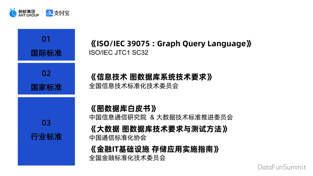 行业标准:和信通院、通信标准化协会、全国金融标准化技术委员会做了《图数据库白皮书》和《图数据库技术要求与测试方法》等等,我们希望和全行业一起来,来普及这个图技术。