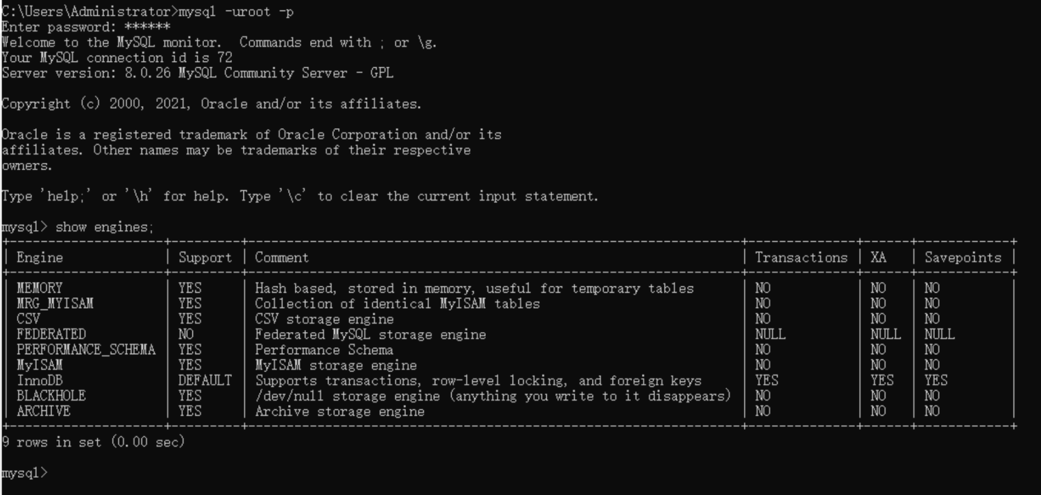 Engine | 当前版本的 MySQL 所支持的引擎类型、引擎名称 |