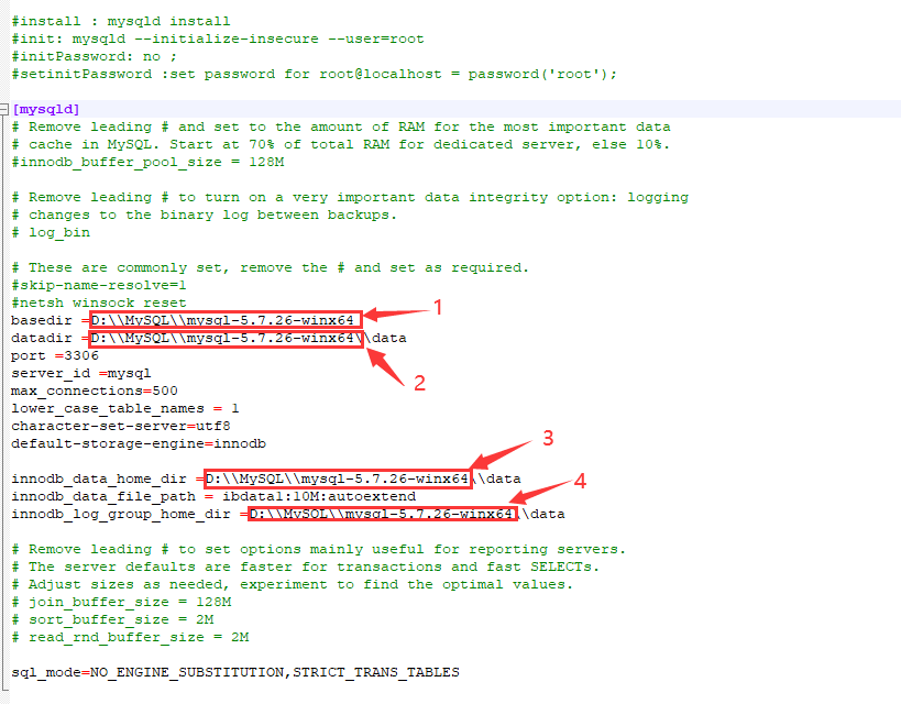 接下来就是修改数据库配置文件了,使用记事本工具打开 my.ini ,修改图中标注的内容并保存。