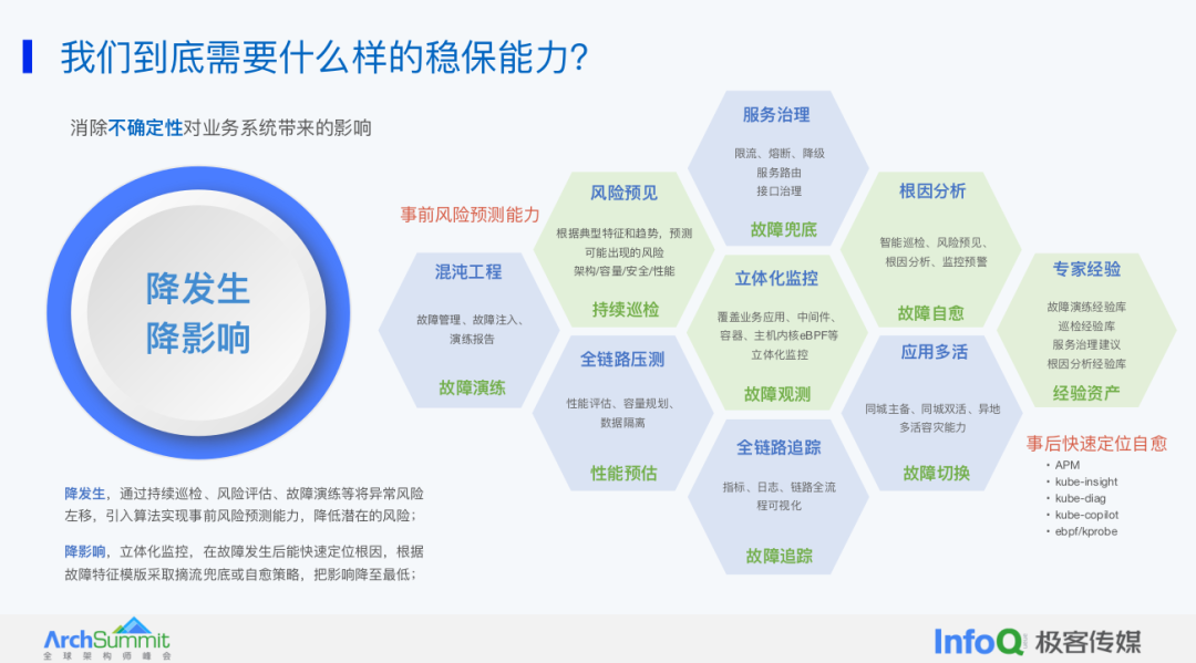 我们总结了内部的经验,学习和参考行业一些领先的实践,参与了信通院制定的稳保相关标准,对齐稳定性保障的目标,也就是降发生和降影响两个大方向,来增强云原生应用架构下的稳定性保障工具体系,应对复杂性和不确定性所带来的风险的能力。
