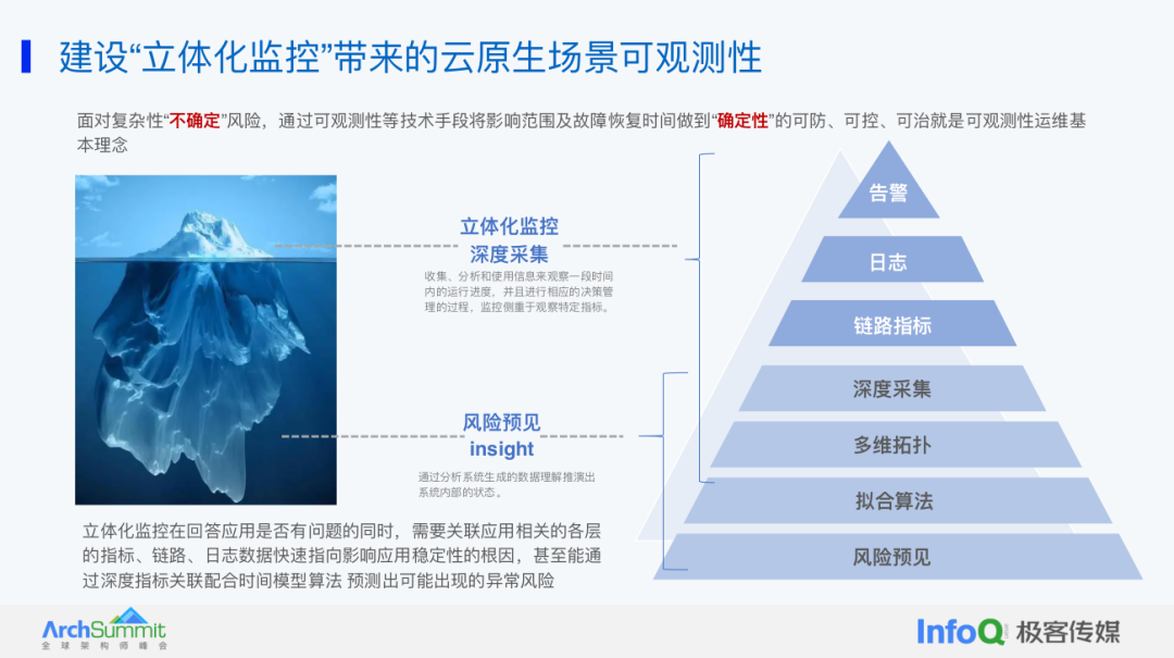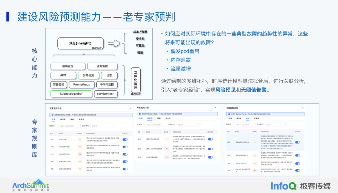 有了立体化监控的数据源作为支撑,基于巡检工具进一步优化,实现风险预见,也称为insight,可以解决实际环境中存在的一些典型故障的趋势性异常,即这些将来可能出现的故障当前还未触发, 或是已经触发了但是因为Pod自动重启、业务重试等原因自动恢复,并未影响实际业务SLA。