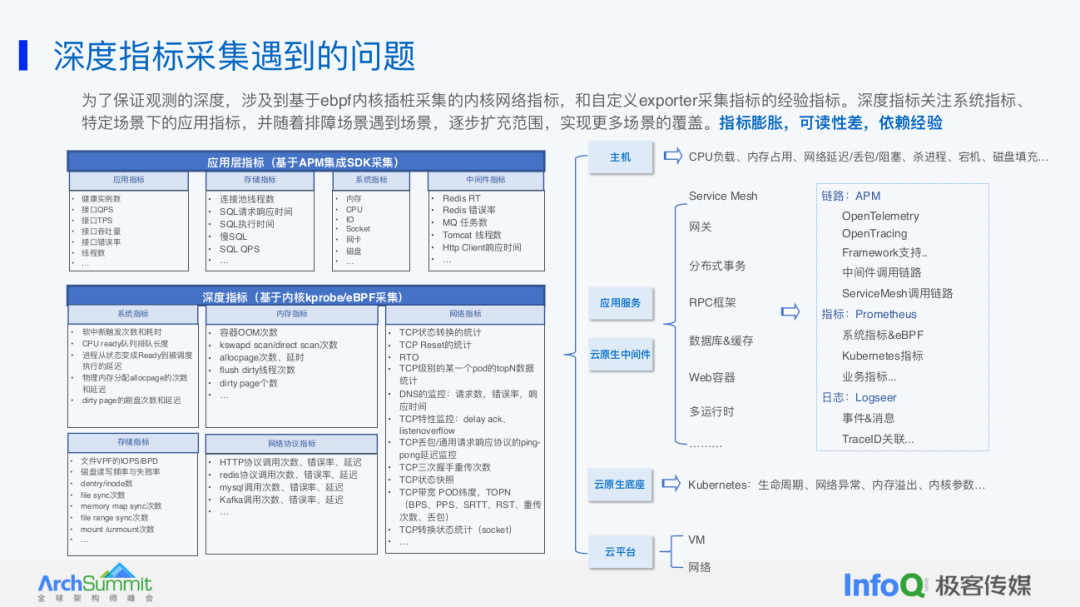 而为了保证监控观测的深度,内核层主机层的指标,往往采用基于eBPF内核插桩采集的内核网络指标,配合K8s下的自研exporter采集的经验指标。这个阶段主要的问题是,指标膨胀非常剧烈,许多内核深度指标相当晦涩,可读性差, 依赖专业人员的判断。因此,我们需要把深度指标场景化关联。