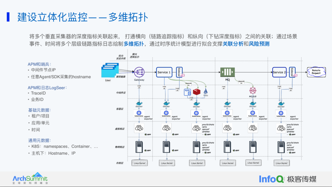 在事中阶段,主要的目标降低系统不稳定的时间 (MTTR),就是发生故障之后能够尽可能快速的定位根因,降低影响范围,快速止血。由于原有监控体系存在孤岛,基于agent的、eBPF的、exporter的来自不同层面的指标日志数据可读性差,出现问题需要排查多个系统,更有甚者还会出现由于无法观测而不了了之的现象。因此这个阶段首先需要通过元数据关联,基于各层级的链路指标绘制多维拓扑,建设立体化监控平台作为可观测能力支撑。