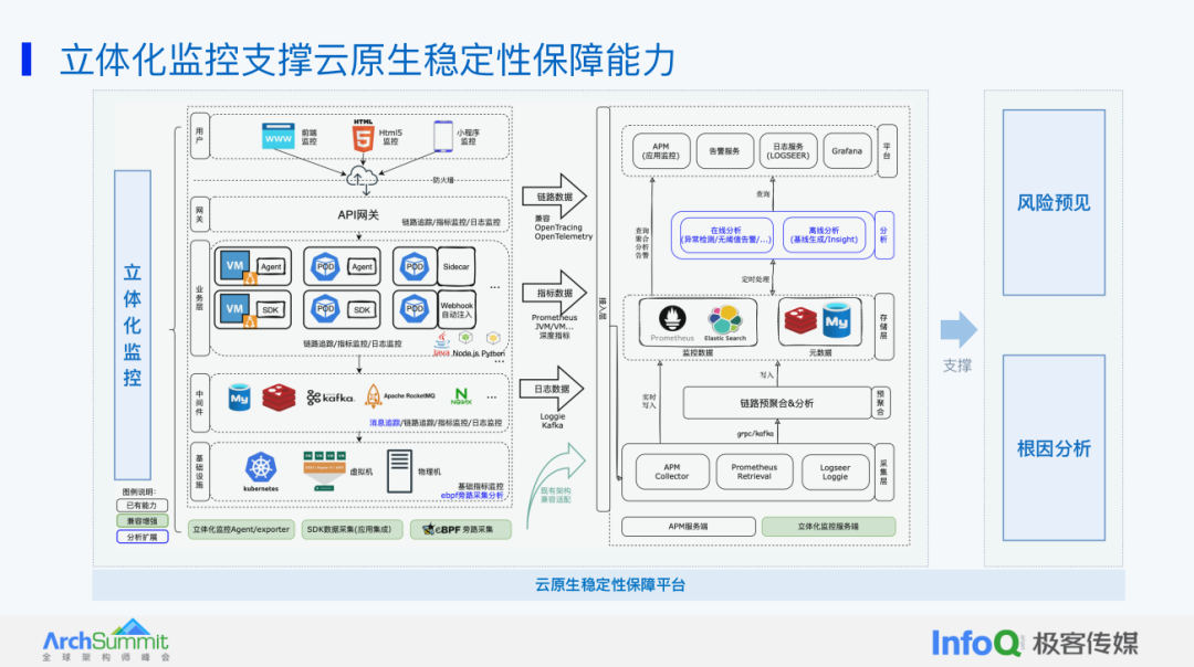 因此,我们整合了应用性能监控APM、以及云底座的包括主机采集哨兵平台、融合内核指标采集eBPF、K8s指标采集工具链Kube-insight 等平台,形成立体化监控平台。以此作为支撑事前风险预见和事后根因分析的基础支撑能力。