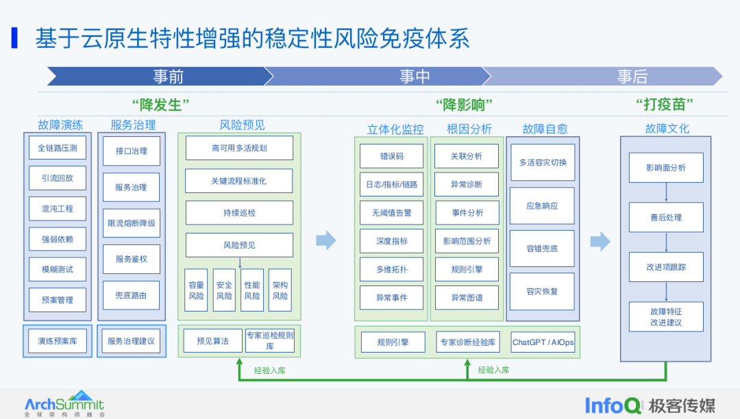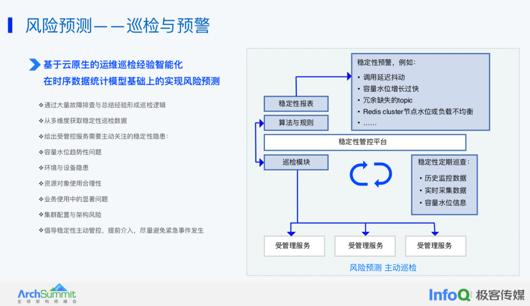 降发生更多关注与事前通过持续巡检、风险评估、故障演练等将异常风险左移,引入时序模型算法实现事前风险预测能力,降低潜在的风险。进而可以动态指导系统架构优化和资源规划。
