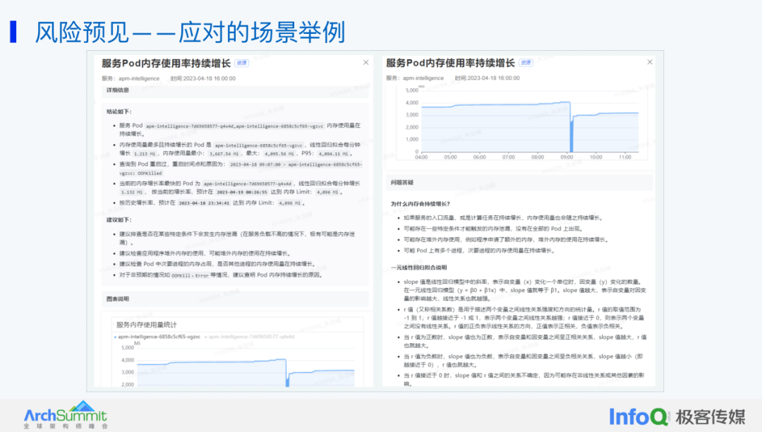 最终给到运维人员风险报告,会详细说明计算经过,容器内存使用量,Pod上次终止的状态,服务在K8s上的资源配置,以及预测风险可能发生的时间,以及相关的排查建议,并附上监控图表。
