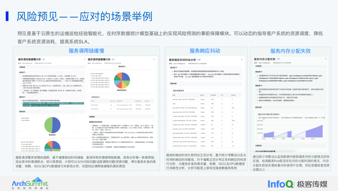 这里是一些风险预见能够辅助支持运维运营进行风险预见的型场景,包括服务调用缓慢、服务响应抖动、服务内存分配失效等。