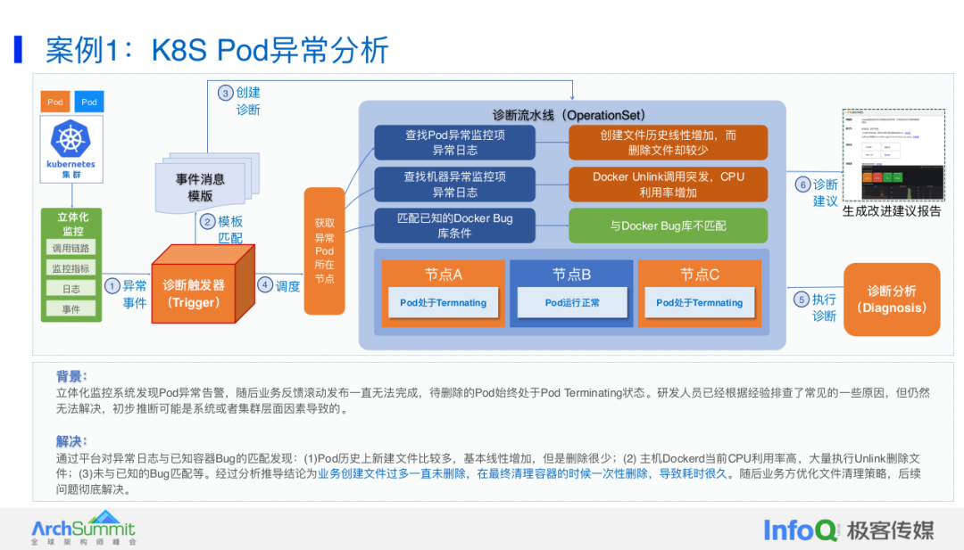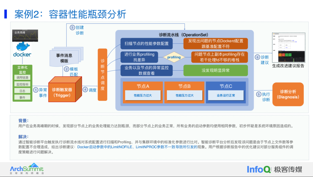 我们设计了手动事件触发的方式,通过手动触发执行诊断流水线对系统配置进行扫描和Profiling,对整个K8s集群环境中的标准化参数进行比对。分析后发现该问题是由于节点上文件数等参数配置不合理造成,给出诊断建议:解决Docker启动参数中的 LimitNOFILE、LimitNPROC 参数不一致的问题。