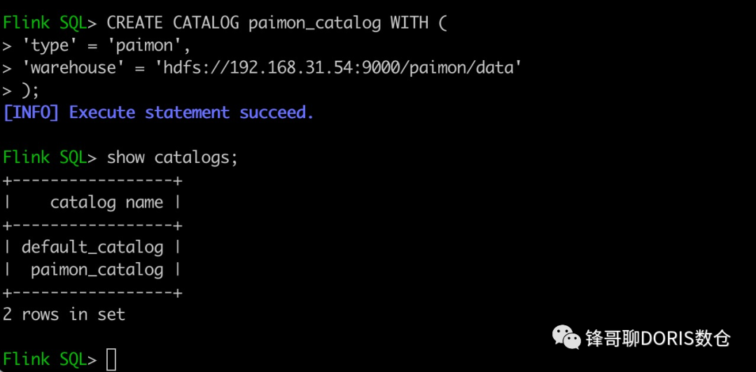 CREATE CATALOG paimon_catalog WITH ('type' = 'paimon','warehouse' = 'hdfs://localhost:9000/paimon/data');show catalogs;