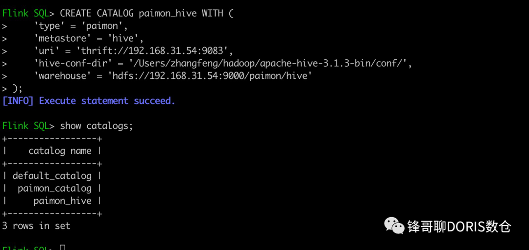 CREATE CATALOG paimon_hive WITH ('type' = 'paimon','metastore' = 'hive','uri' = 'thrift://localhost:9083','hive-conf-dir' = '/Users/zhangfeng/hadoop/apache-hive-3.1.3-bin/conf/','warehouse' = 'hdfs://localhost:9000/paimon/hive');show catalogs;