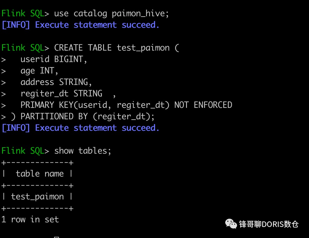 USE CATALOG paimon_hive;CREATE TABLE test_paimon_01 (userid BIGINT,age INT,address STRING,regiter_dt STRING ,PRIMARY KEY(userid, regiter_dt) NOT ENFORCED) PARTITIONED BY (regiter_dt);show tables