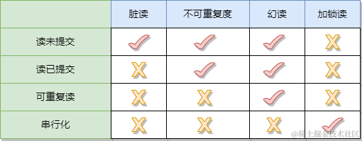 不同的事务隔离级别在并发事务下也会产生不同的问题,如下图(脏读、不可重复读、幻读)