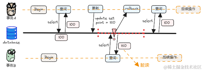启动两个事务A、B,事务A查询到的值是100,然后进行Update将point设置为150,此时事务A未提交,而事务B查询的时候值是150。而此时事务B已经读取到150进行后续业务了,但是事务A混滚,事务B的数据就是脏数据了(脏读)