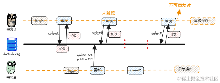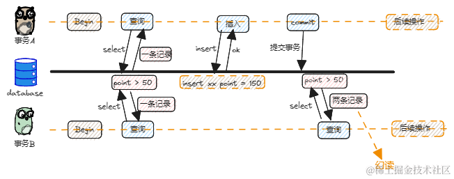 而如果一开始事务A查询的值是100,事务B进行Update了Point的值,改成200,事务A再查询的值就是200,事务B回滚后,造成了事务A两次读取结果不一致(不可重复度),这里就不再画图了。
