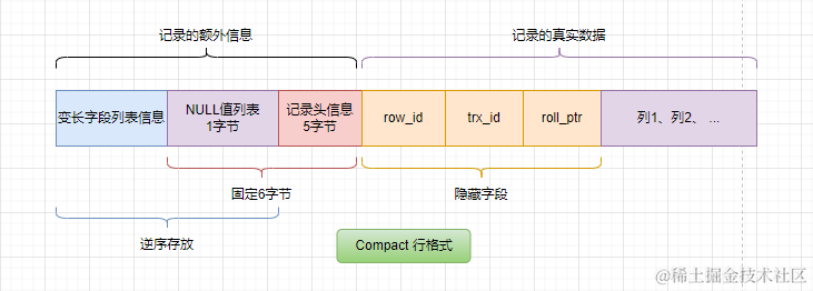 这里用之前的文章老图来看,有兴趣的同学可以回过去看看【传送门:MySQL InnoDB 行记录存储结构】
