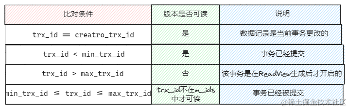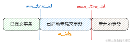 • min_trx_id <= trx_id < max_trx*id:判断 *trx_id 是不是在当前事务ID集合(m_ids)里面