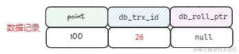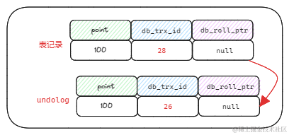 此时事务A能查询到point值为100, 符合db_trx_id < min_trx_id规则,所以能查询到当前版本数据记录, 但是第而次读之前事务B对进行了修改,并提交了事务,此时可见的版本链数据如下图: