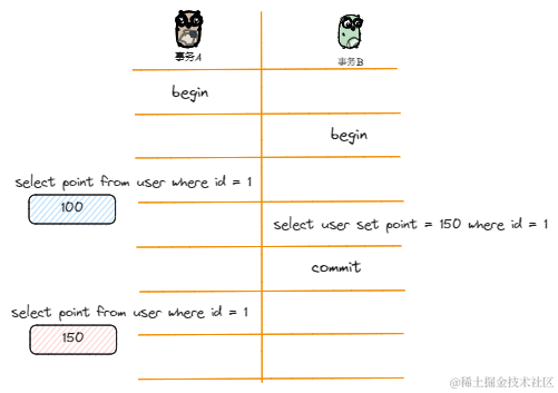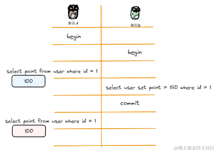 启动两个事务A、B,事务A查询到的值是100,此时事务B将point的值改为150(事务未提交),事务A查询到的值还是100,而事务B提交后,事务A查询到值是150。事务A相同条件下两次查询的结果不一致,虽然解决了脏读,但是没做到可重复读,同样没法解决幻读。
