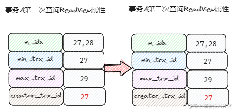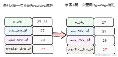 我们在来看事务ID分别为27和28的A、B读取trx_id 为 26 的记录,事务A进行了两次次查询,而第二次是在事务B提交之后,我们来两次次查询生成的ReadView的区别: