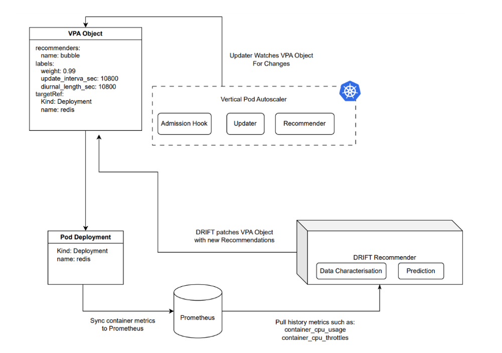 其中 DRIFT Recommender 从 Prometheus 中获取所需数据,并通过 VPA 推荐算法,给出对应的数据值。其整体算法包括了主动预测,负载感知以及预测反馈三部分: