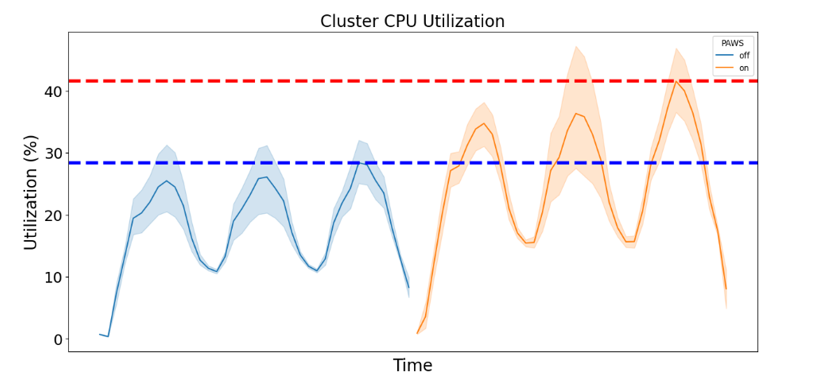 文中所述的 Performance Aware System 通过机器学习与数理分析手段,对负载资源的分配与调度进行优化。我们在实验室场景下模拟了包括 Redis,Nginx 和 Torchserve 等在内的一些典型应用,并通过搭建 10 台服务器的小型集群进行验证。通过测试发现,集群整体利用率在部署前后出现明显的提升。下图为其中某一个节点的利用率变化情况,该节点的峰值利用率从 30%提升到了 40%以上。