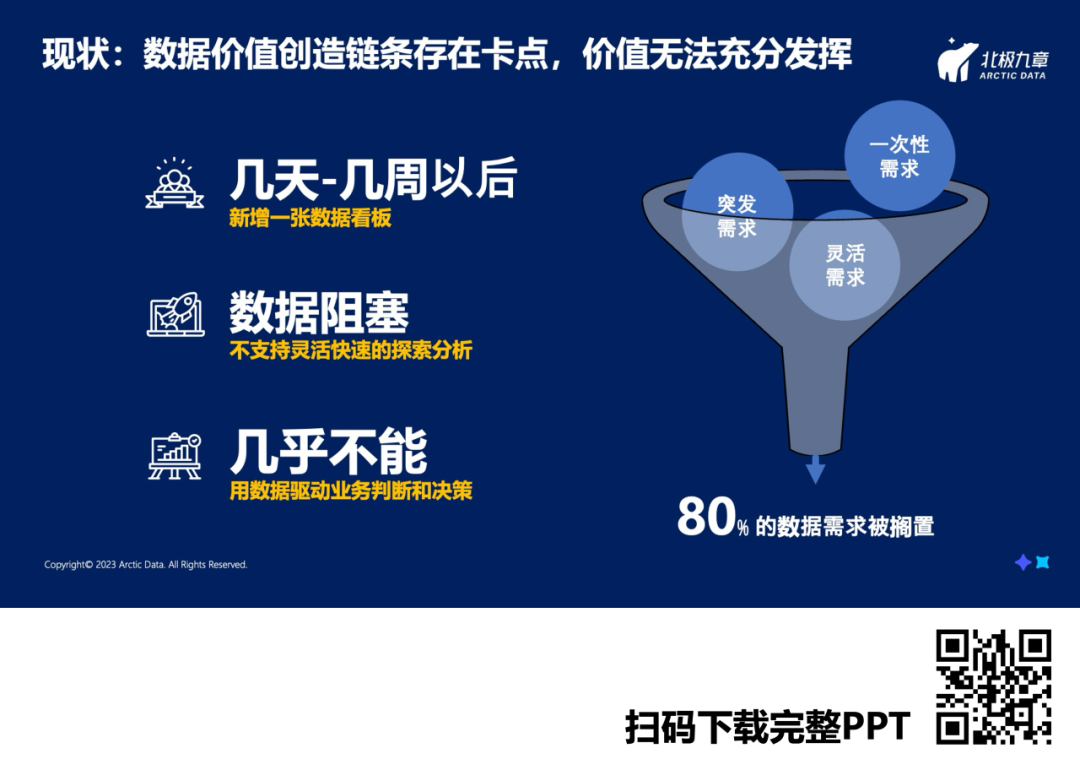 我们知道数据是有生命周期的,一旦过了时效性,数据的价值就不会那么大。就像刚刚过去的双11,我的双11市场的情况过了一个星期再分析出来的话,这个数据报表就已经过期了。而同时大量数据需求还源源不断地提交给分析师,我们的分析师每天都在加班加点地满足来自于各个部门的数据分析需求。