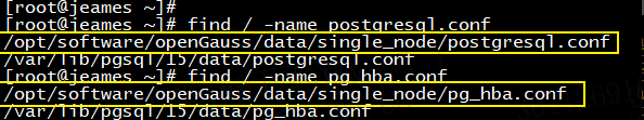 [root@jeames ~]# find -name postgresql.conf/opt/software/openGauss/data/single_node/postgresql.conf/var/lib/pgsql/15/data/postgresql.conf[root@jeames ~]# find -name pg_hba.conf/opt/software/openGauss/data/single_node/pg_hba.conf/var/lib/pgsql/15/data/pg_hba.conf[root@jeames ~]# cd opt/software/openGauss/data/single_node[root@jeames single_node]# cp postgresql.conf opt[root@jeames single_node]# cp pg_hba.conf opt