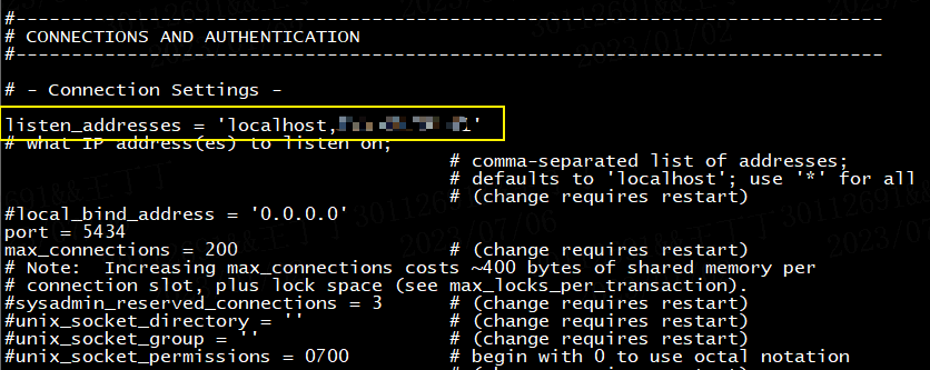 修改postgresql.conf配置项listen_addresses将 listen_addresses = ‘localhost’ 修改为 listen_addresses = ‘localhost,192.168.0.95’其中192.168.0.95 为openGauss所在服务器实际的IP。注意, 配置项listen_addresses 前面的#要去掉,逗号为英文逗号。