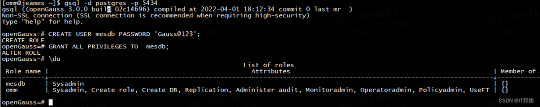 在openGauss创建业务用户并赋予权限[omm@jeames ~]$ gsql -d postgres -p 5434openGauss=# CREATE USER mesdb PASSWORD ‘Gauss@123’;openGauss=# GRANT ALL PRIVILEGES TO mesdb;openGauss=# \du