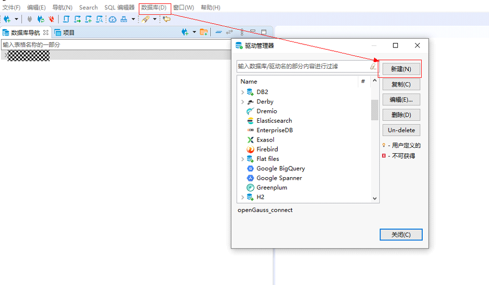 点击确定后,驱动管理器就会出现新的openGauss的类型,点击关闭即可。