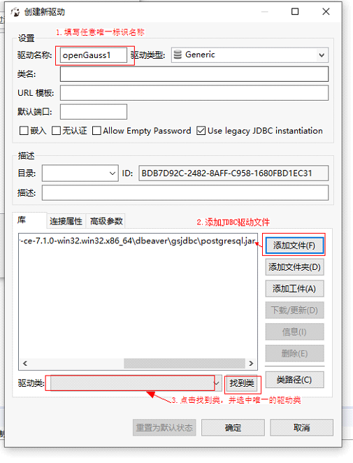 在创建新驱动中选择库页签,然后添加文件选择本地的opengauss-jdbc-3.0.0.jar·,然后点击下面的找到类,选择下拉框里出来的驱动类