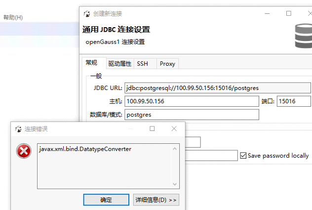 **解决方法 *: 本地安装的java版本无javax.xml.bind.jar这个包, 可以在添加JDBC驱动jar包时额外增加此包:https://mvnrepository.com/artifact/javax.xml.bind/jaxb-api/2.2.2