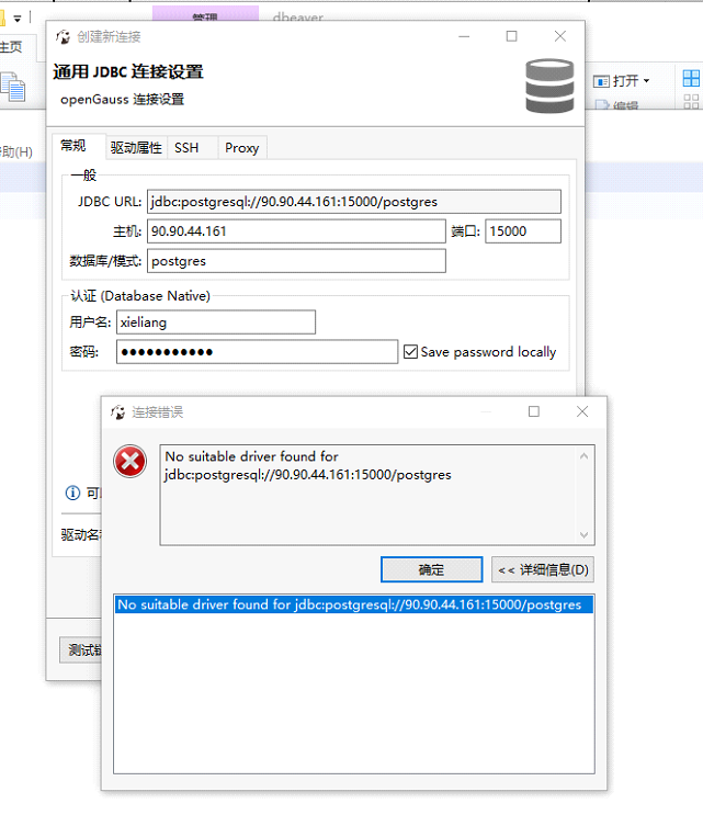 注意:名称自己定,主机和端口号为openGauss的服务器IP和安装时配置的端口,连接用户不能用omm)及对应密码。