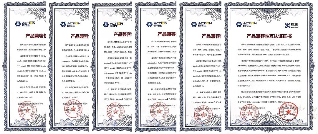 上海爱可生信息技术股份有限公司(以下简称“爱可生”)与上海爱数信息技术股份有限公司(以下简称“爱数”)、北京捷科智诚科技有限公司(以下简称“捷科智诚”)相继完成产品兼容认证。爱可生云树数据库集群管理平台软件【简称:CTREE DMP】V7.0、云树数据库云服务平台软件【简称:CTREE RDS】V9.0、云树数据库SQL质量管理软件【简称:CTREE SQLE】V1.0、云树分布式数据库软件分别于爱数AnyBackup Enterprise 7完成产品兼容测试;爱可生云树数据库集群管理平台软件【简称:CTREE DMP】V7.0、云树数据库云服务平台软件【简称:CTREE RDS】V9.0、云树分布式数据库软件分别于捷科智诚一体化测试平台【简称:JettoPro】、性能测试平台【简称:JettoLoader】完成产品兼容测试。
