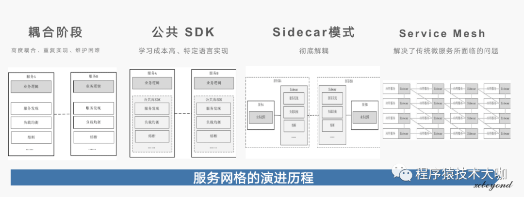 耦合阶段:高度耦合、重复实现、维护困难,在耦合架构设计中体现的最为突出,单体架构就是典型的代表。 公共 SDK:让基础设施功能设计成为公共 SDK,提高利用率,是解藕最有效的途径,比如 Spring Cloud 就是类似的方式。但学习成本高、特定语言实现,却将一部分人拦在了门外。 Sidecar 模式:再次深度解藕,不单单功能解藕,更从跨语言、更新发布和运维等方面入手,实现对业务服务的零侵入,更解藕于开发语言和单一技术栈,实现了完全隔离,为部署、升级带来了便利,做到了真正的基础设施层与业务逻辑层的彻底解耦。另一方面,Sidecar 可以更加快速地为应用服务提供更灵活的扩展,而不需要应用服务的大量改造。 Service Mesh:把 Sidecar 模式充分应用到一个庞大的微服务架构系统中来,为每个应用服务配套部署一个 Sidecar 代理,完成服务间复杂的通信,最终就会得到一个的网络拓扑结构,这就是服务网格,又称之为“Service Mesh“。它从本质上解决了传统微服务所面临的问题。