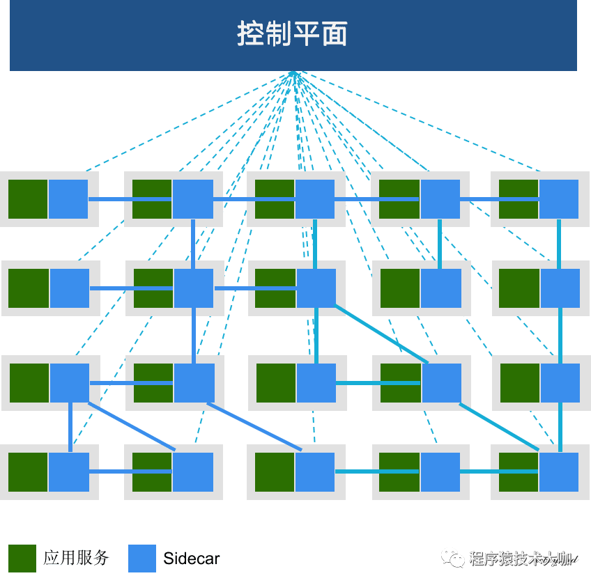 数据平面: Sidecar,与服务部署在一起的轻量级网络代理,用于实现服务框架的各项功能(如,服务发现、负载均衡、限流熔断等),让服务回归业务本质。 数据平台可以认为是将 Spring Cloud、Dubbo 等相关的微服务框架中通信和服务治理能力独立出来的一个语言无法的进程,并且更注重通用性和扩展性。在 服务网格 中,不再将数据平面代理视为一个个独立的组件,而是将这些代理连接在一起形成一个全局的分布式网格。 在传统的微服务架构中,各种服务框架的功能(如,服务发现、负载均衡、限流熔断等)代码逻辑或多或少的都需要耦合到服务实例的代码中,给服务实例增加了很多无关业务的代码,同时带来了一定的复杂度。 有了 Sidecar 之后,服务节点只做业务逻辑自身的功能,服务之间的调用只需交给 Sidecar,由 Sidecar 完成注册服务、服务发现、请求路由、熔断限流、日志统计等业务无关功能。 在这种新的微服务架构中,所有的 Sidecar 组成在一起,就形成了服务网格。那么这个大型的服务网格并不是完全自治的,它还需要一个统一的控制节点 Control Plane。 控制平面: 是用来从全局的角度上控制 Sidecar,相当于服务网格整体的大脑,控制着 Sidecar 来实现服务治理的各项功能。比如,它负责所有 Sidecar 的注册,存储统一的路由表,帮助各个 Sidecar 进行负载均衡和请求调度;它收集所有 Sidecar 的监控信息和日志数据。