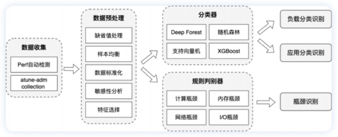在进行模型训练前,必须完成多个软件数据的收集,并对数据进行特征工程。我使用A-Tune自带的数据收集命令,确保了数据采集的顺利进行。由于我在虚拟机中部署A-Tune,在收集数据时无法获取到perf数据。查阅相关资料后发现,确实有部分硬件环境无法收集到perf数据。因此,我增加了自动识别是否可用perf数据进行训练和识别的功能,以提高训练效率。接着,原本A-Tune已支 持对应用场景进行分类,但存在一个问题,需要先识别出工作负载类型,再对应用进行分类。为提高准确率、减少由于识别错误导致的应用场景错误分类,与张桶老师商讨后,决定将工作负载识别 与应用场景识别分开。