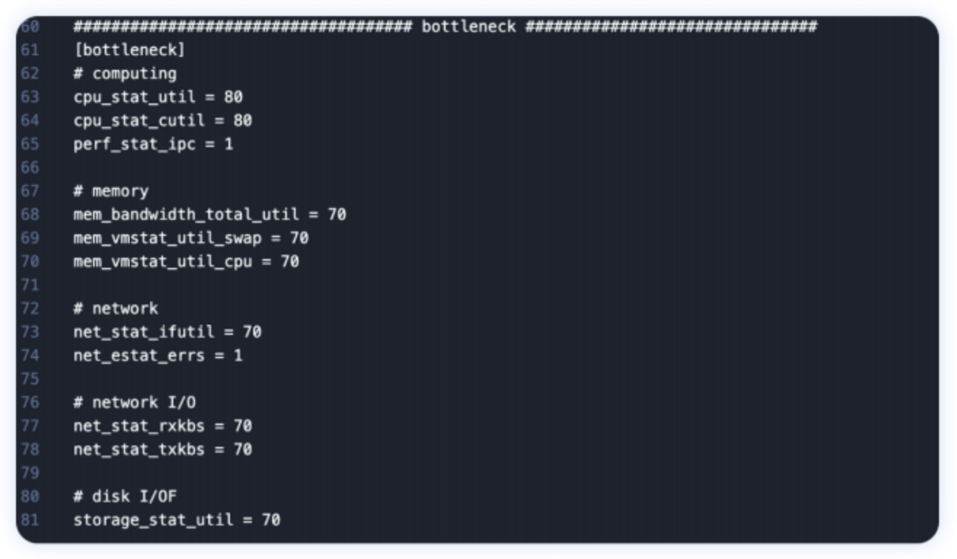 同时,张桶老师建议新增负载瓶颈识别功能。在完成这一功能的过程中,我发现机器学习方法需要 大量的标记数据、计算资源和推理时间,而且模型的泛化能力和可解释性相对较低。相比之下,基 于规则的方法更直观、适应性强,计算效率高,且具有高可解释性。因此,我通过规则判断是否存 在计算、内存、网络、网络I/O或磁盘I/O瓶颈。为了便于可扩展,我编写了可扩展的代码,后续只 需在 "init" 方法中新增相应的指标即可进行扩展。为了方便用户修改國值,将相应的國值存 储在A-Tune/misc/engine.cnf中,作为A-Tune配置参数的一部分,用户只需修改该文件的值即可实 现自定义國值。