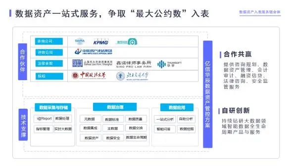 亿信华辰现与DAMA中国、毕马威、数支科技、中联资产评估集团、北京鑫诺律师事务所、中国政法大学、北京交通大学等成立数据资产入表服务链合体,拉通会计服务提供方、数据合规评估方、数据资产评估方、数据技术服务方等资源,构建全流程闭环式服务体系,为客户提供一站式数据资产解决方案,提供咨询规划、数据资产管理、会计审计、法律咨询、安全监管服务,保障数据资产入表规范可信,促进数据要素经济高质量发展。