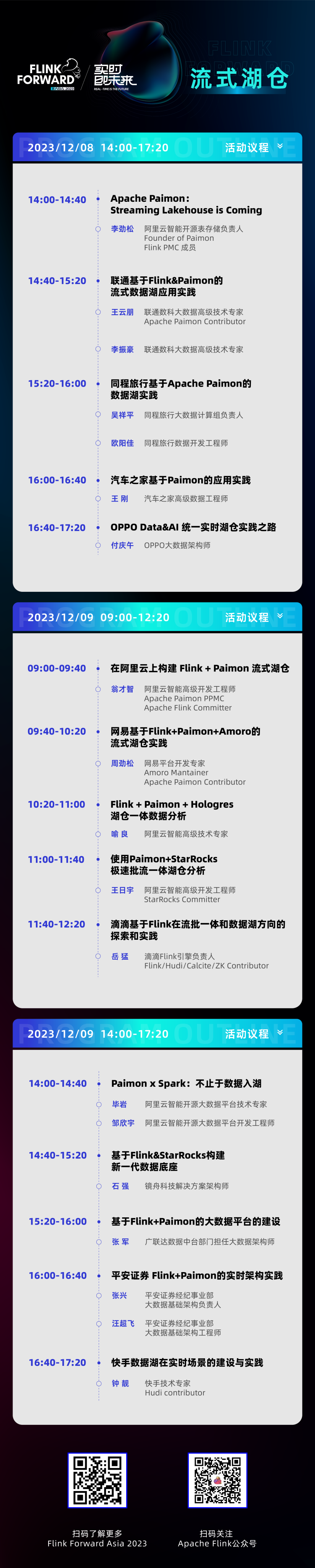 流式湖仓专场邀请阿里云智能、联通、同程旅行、汽车之家、OPPO、网易、滴滴、镜舟科技、广联达、平安证券、快手等企业技术专家解读基于 Flink + Paimon 构建流式数据湖相关问题,更有基于 Paimon + StarRocks、Flink + Paimon + Hologres、Paimon + Spark 的流式湖仓最佳应用实践与分析。